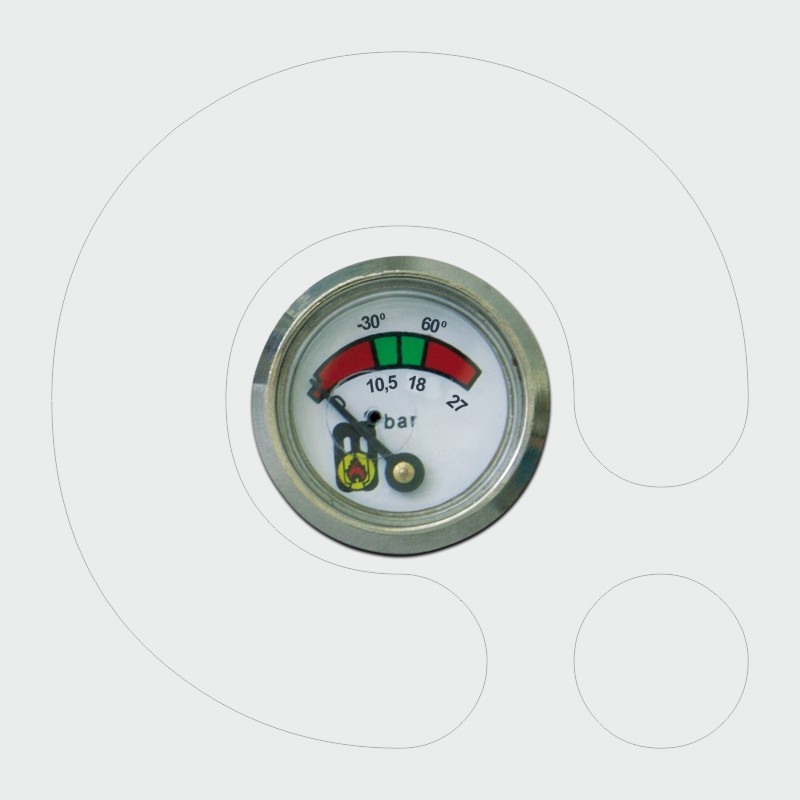 Fire extinguisher gauge featuring a testing hole, with a diameter of 27 mm and a pressure range of 0 to 27 bar; GEAR type.