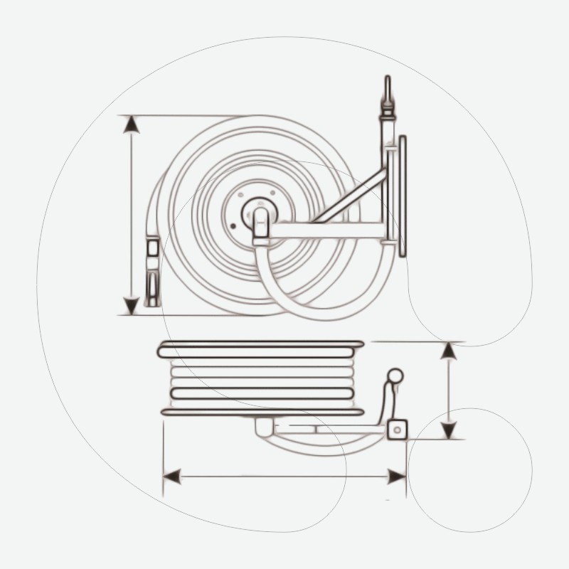 Wall-mounted stainless steel automatic swinging hose reel with gauge and fire hose 1” (30 m). Ready to use. Includes nozzle. Minimum cabinet size (WxHxD): 700 x 700 x 260 mm.