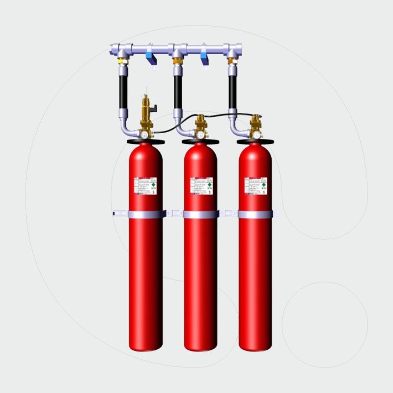 Cilindra çeliku më presion të lartë, pa tegel saldimi, dhe me kapacitete të ndryshme, të ngjyrosur me ngjyrë elektrostatike të kuqe, qafa e ngjyrosur me ngjyrë të hirtë. Cilindrat janë të certifikuar sipas 99/36/EC dhe EN 1964-1 (π). Sistemi i valvulave aktivizohet në mënyrë pneumatike – manualisht përmes përdorimit të potencës të një sigurese. Si më lartë një valvulë me aktivizim elektrik mund të përdoret, në varësi të nevojave të përdoruesit. Cilindri pilot nga çeliku me kapacitet 3lit., që përmban azot, valvulë e cila aktivizohet me anë të siguresës dhe më dorë ose valvula të cilat aktivizohen në mënyrë elektrike në varësi të kërkesave të përdoruesit (cilindri pilot përdoret në rast kur një bateri ka më shumë se dy cilindra). Cilindri më presion të lartë është i certifikuar sipas 97/23/EC nga TUV (CE 0036).